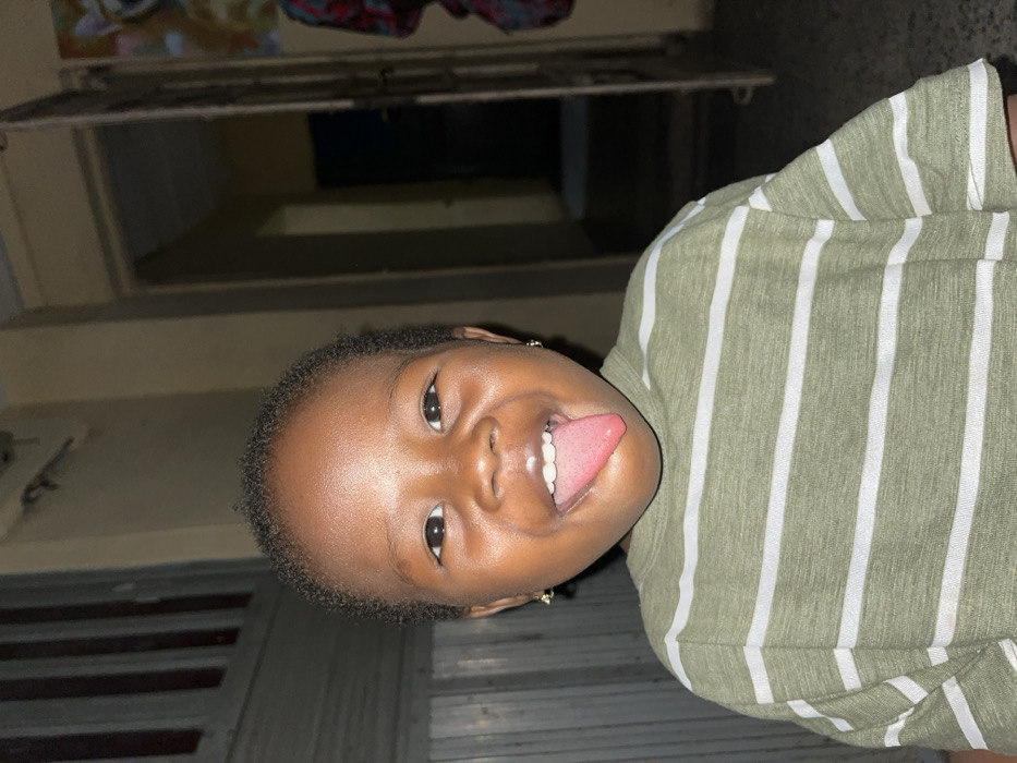 A young girl smiles, sticking her tongue out. Her skin is smooth and dark, and her eyes are wide. She has a short, dark haircut. She wears small gold earrings. The girl is clad in a green and white striped shirt. The background is blurry, showing a building-like structure. The image is slightly tilted, and the lighting gives a warm tone to the scene.