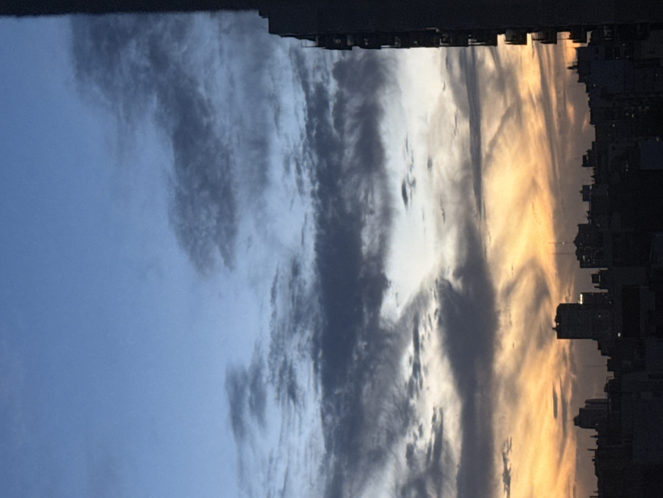 A vertical cityscape silhouetted against a vibrant sunset. The sky is a gradient, transitioning from a clear blue to hues of orange and yellow. Layered clouds stretch across the vista, some dark and ominous while others are illuminated by the setting sun. Buildings are tightly packed, their shapes indistinct against the bright sky. The overall composition evokes a sense of urban beauty.