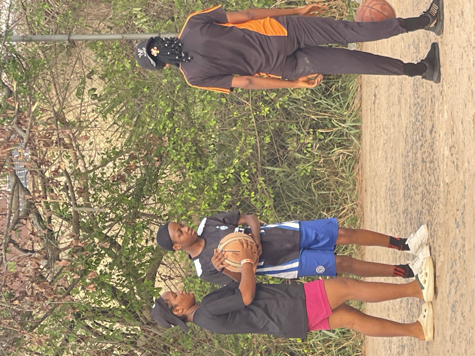 Three individuals stand near lush greenery and a paved surface. Two people hold a basketball, positioned closely and facing each other. The first person wears a black shirt and pink shorts, while the second wears a black and blue shirt with blue shorts. A third person stands apart wearing a black shirt with orange panels and dark pants. This person also has a basketball near their head.