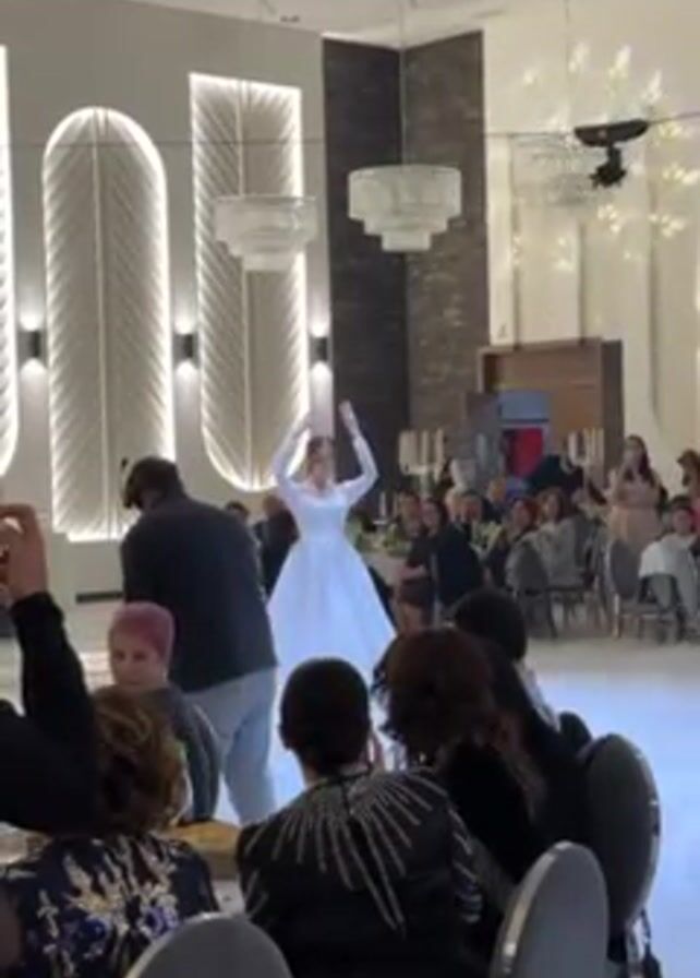 A young woman in a white dress is dancing on a dance floor in what appears to be a banquet hall or reception venue. The space is well-lit with modern chandeliers and decorative wall panels. Several people are seated at round tables surrounding the dance floor, some of whom are watching and recording the woman with their phones. There's a fog or haze effect on the dance floor around the woman. A man with a camera is walking backward in front of her, filming her. Other people are sitting and eating at the tables.