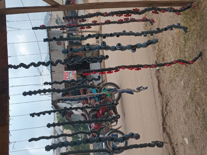 This image captures an outdoor scene in Dam Camp, Nigeria, displaying irrigation or plumbing components for sale