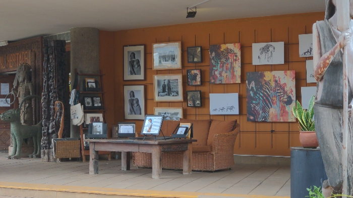 The image depicts an indoor or sheltered outdoor exhibition space in Arusha, Tanzania, likely within the Arusha Declaration Museum or a cultural heritage institution, evidenced by a partially visible "HERITAGE" inscription on a large carved wooden structure on the far left