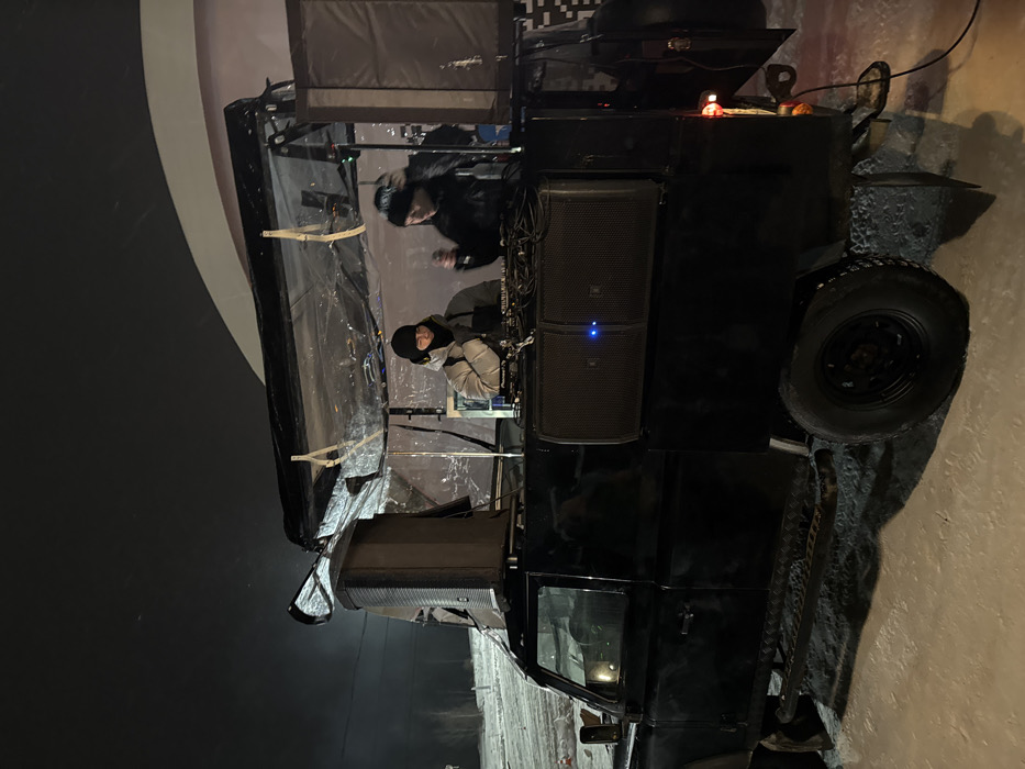 A black vehicle, likely a customized truck, features audio equipment like speakers and a soundboard set up for DJing. Two people are on the truck, one seated and one standing, both wearing hats. The vehicle has a makeshift roof covered with a tarp-like material. It's parked next to a building with a curved black and white design, possibly at an event or performance space, and there appears to be snow or ice on the ground nearby.