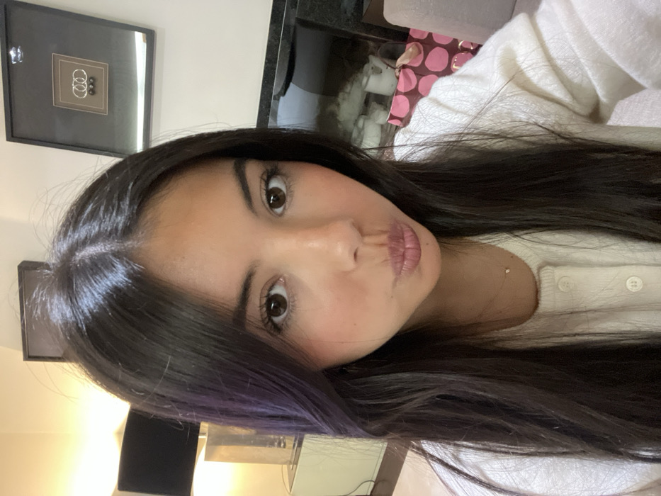 A young woman with long, dark hair and brown eyes puckers her lips in a selfie. She wears a white cardigan with buttons. A glimpse of a delicate necklace is visible on her neck. In the background, a framed picture hangs on the wall above what appears to be a dark countertop. Hints of pink and white items are also visible behind the woman. The bottom of her hair has hints of purple.