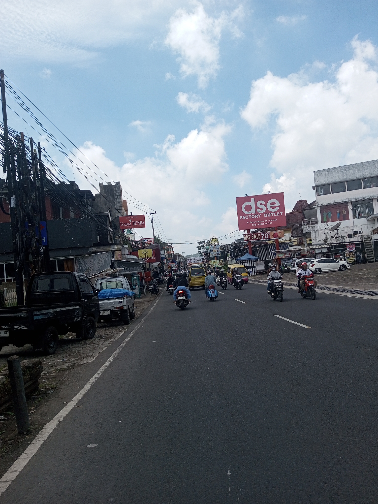 street scene with several motorcycles traveling on a paved road in what appears to be a bustling commercial area. The sky is partly cloudy. On the left side of the road, there are utility poles with numerous wires and two small pickup trucks parked. Buildings line both sides of the street, with signs visible for businesses like "KEDAI BUNDA", "Alfamart" and "dse FACTORY OUTLET". The environment suggests a moderately urbanized location.