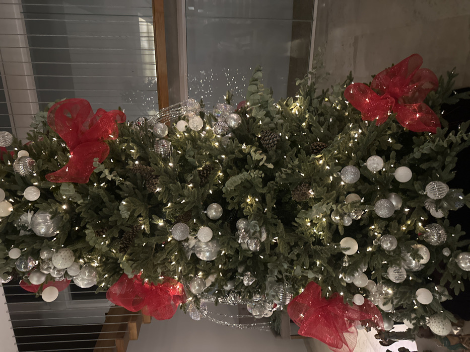 - "A decorated Christmas tree is adorned with white and silver ornaments, pinecones, and red bows" by FM-IlG2F3, licensed under CC BY 4.0