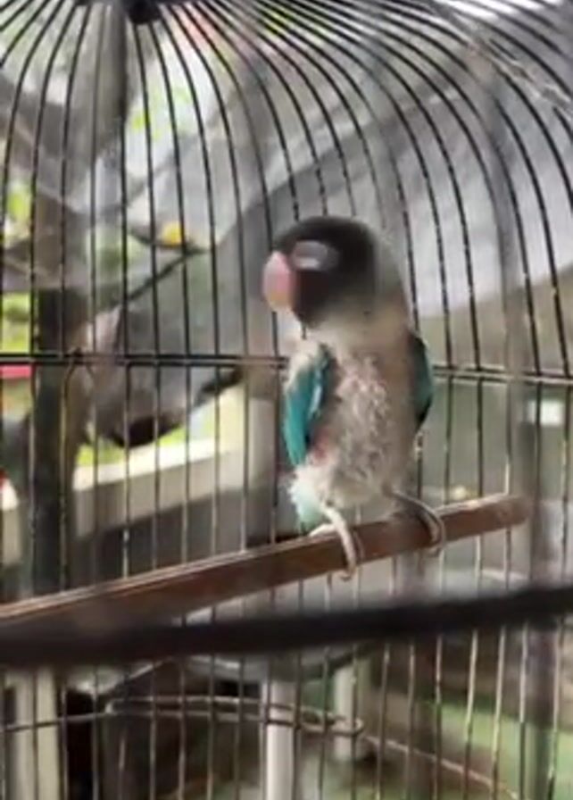 A young grey-and-turquoise parrot sits on a wooden perch inside a wire cage. The bird is slightly ruffled and has a pink beak. The cage is placed outside near a window, and the sound of rain can be heard.