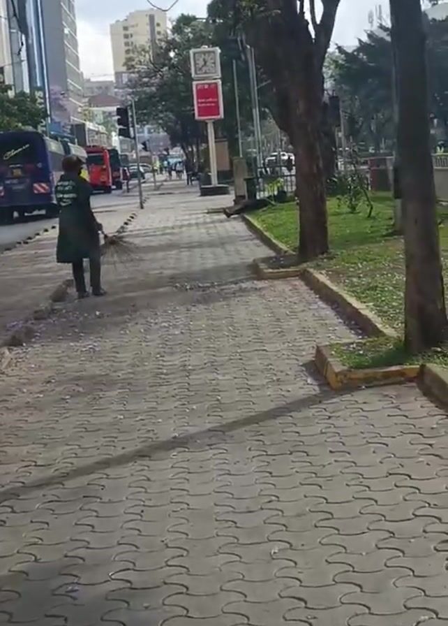 A woman in a dark green uniform sweeps a stone-paved sidewalk with a long-handled broom. She is working along a city street with traffic and tall buildings visible in the background. The sidewalk is lined with trees and a small patch of grass. There is purple debris scattered on the ground, presumably fallen blossoms.