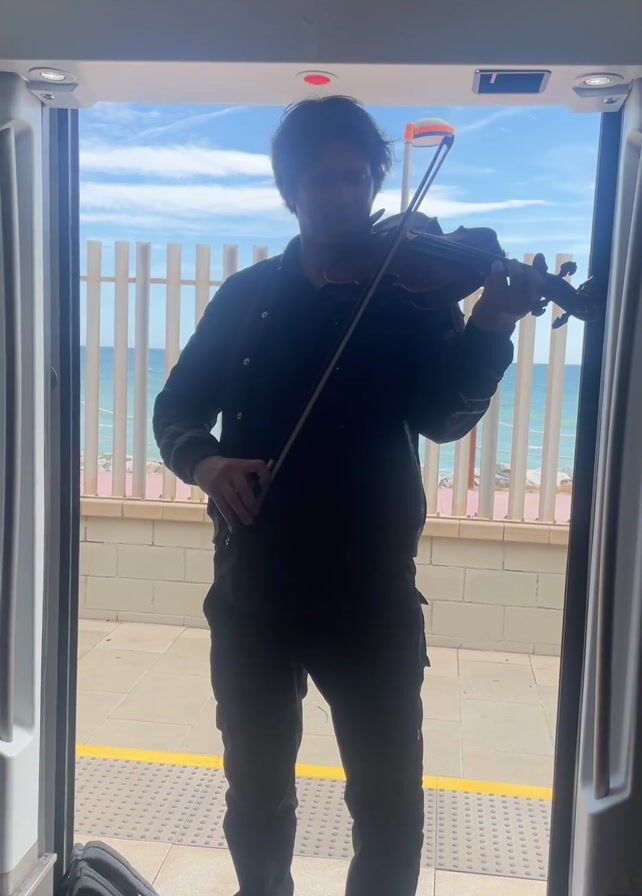 A man stands in the doorway of a train, playing a violin. He is facing forward, but glances at the camera at one point. He is wearing dark clothing and brown boots. Behind him, the doors are open, revealing a view of the ocean behind a white fence. A backpack sits on the train floor nearby.