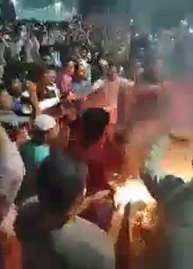 crowd of people gathered around a fire. The crowd appears to be mostly men, and many of them are wearing traditional clothing. There is a lot of smoke and fire. People are raising their hands and yelling. The video is shaky and the quality is poor.