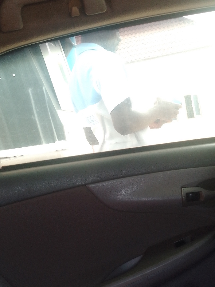 The image is taken from the inside of a car, looking out the window. The passenger-side window is rolled down. There is a person standing outside the car, partially visible through the window. The person is wearing a light blue shirt and a white uniform. The person is holding an object in their right hand. It is unclear what the person is doing. The image is overexposed, making it difficult to see any details about the environment outside the car. The coordinates provided, latitude: 8.829, longitude: 7.567, are not in the city of Karshi, Nigeria. They are in the town of Kafanchan in Kaduna State, Nigeria.