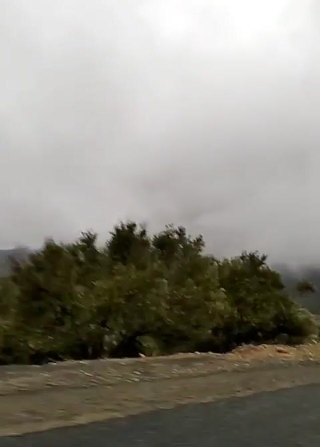 view of a mountainous landscape under a heavily overcast sky. Patches of clouds cling to the mountain peaks in the distance, partially obscuring them. In the foreground, there are several green trees or bushes, and a paved road runs along the bottom of the frame. The camera appears to be moving, as the scenery shifts slightly. The overall tone of the video is gloomy due to the weather conditions.