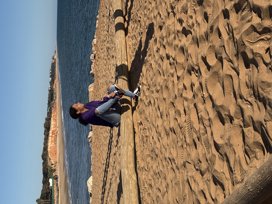- "A young female is seated on a large, weathered wooden log on a sandy beach in Quarteira, Portugal" by FM-tlaWu1, licensed under CC BY 4.0