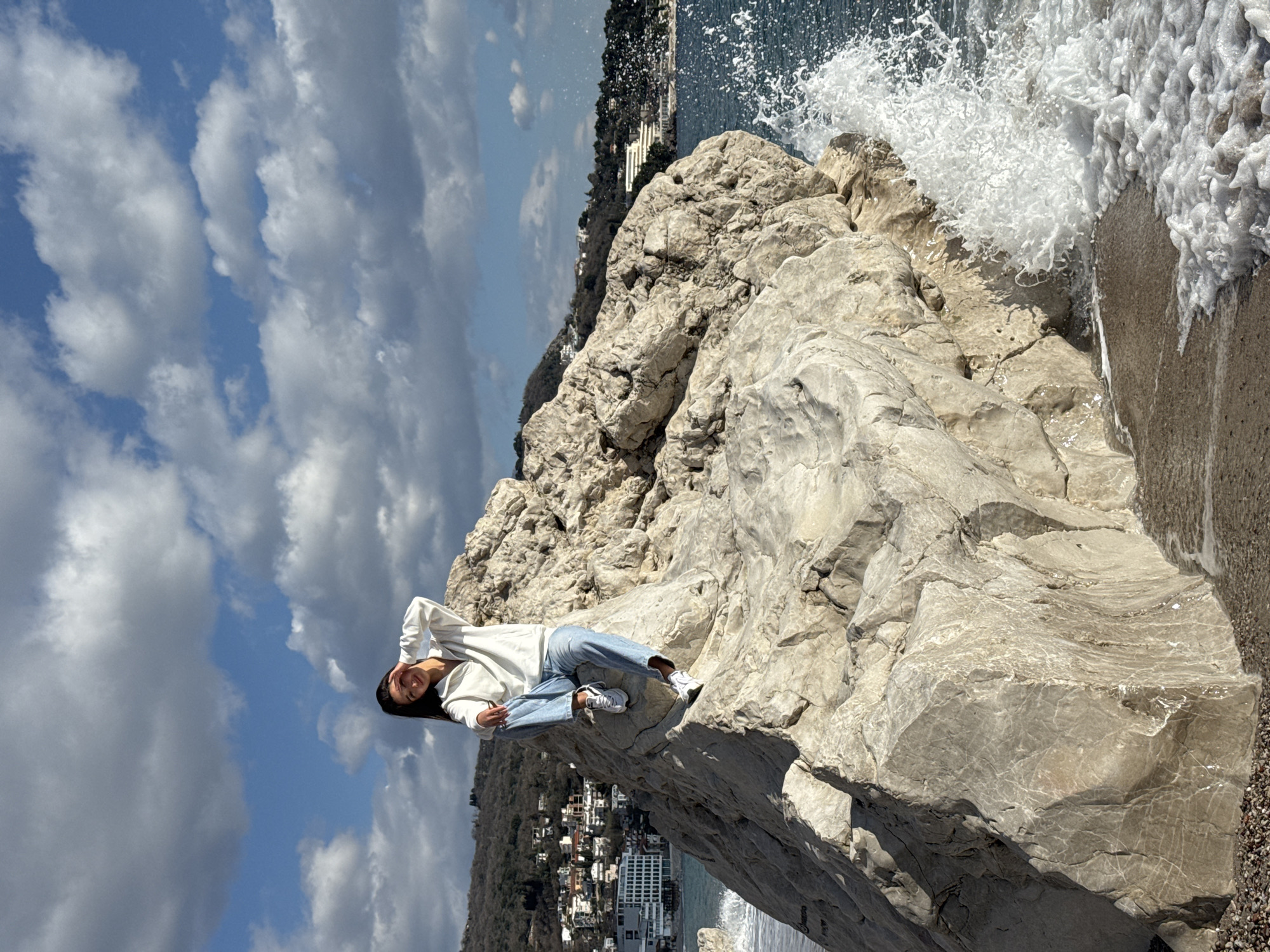 The image depicts a coastal scene in Sutomore, Montenegro. A single female subject, with long dark hair, is seated on a large, light-colored, fractured rock formation that dominates the foreground and midground. She is wearing a white long-sleeved quarter-zip top, light blue denim jeans, and white athletic shoes with dark accents. Her left hand is raised, palm positioned over her forehead, ostensibly shielding her eyes from direct sunlight, and she exhibits a smile directed towards the camera. To the right of the rock formation, dark blue ocean water is visible, with significant wave action creating white foam and splashes as it collides with the rock and a narrow, pebbled shoreline. The immediate foreground consists of damp sand and pebbles, partially covered by retreating wave foam. In the background, across the water, hills covered with sparse vegetation rise, displaying numerous white and light-colored buildings, indicative of a developed coastal settlement. The sky is partly cloudy, featuring large white and grey cumulus clouds interspersed with areas of clear blue.