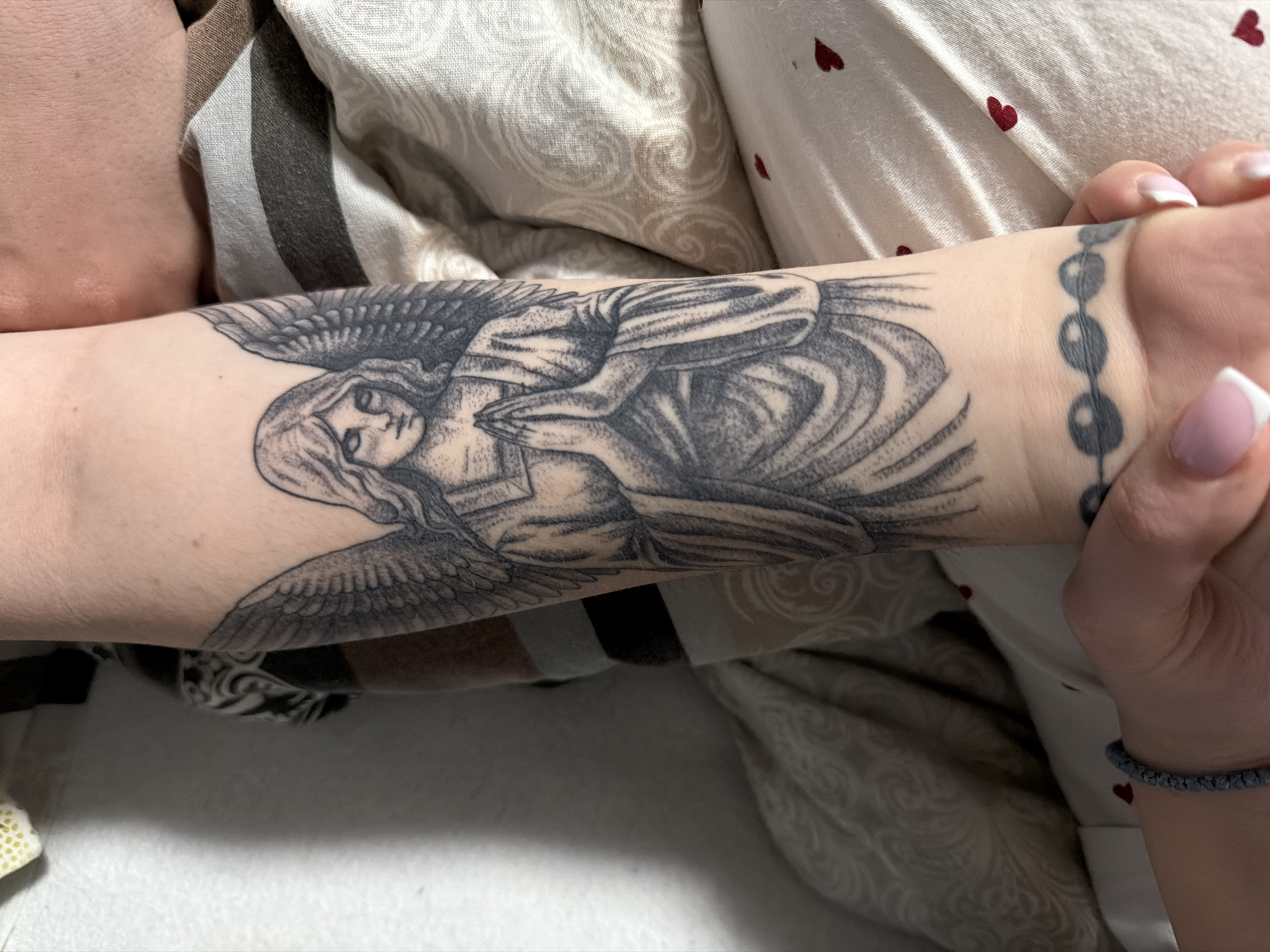 The image displays a close-up of a person's right forearm and hand in an indoor setting, specifically a bedroom in Goce Delcev, Bulgaria. The forearm features a large, black and gray tattoo of an angel with wings, long hair, and hands clasped together in a praying position. The angel exhibits a solemn facial expression. Below this main tattoo, a secondary black tattoo resembling a string of beads or pearls encircles the wrist. The visible hand, belonging to the same individual, has fingernails manicured with a pink and white French tip style. A gray braided bracelet is worn on the wrist. The background consists of bed linens: a striped blanket (brown, black, and cream) partially visible near the upper arm, a cream-colored blanket with a subtle swirling pattern, and a white sheet adorned with small red heart motifs. A plain light-colored wall or headboard is visible to the left.