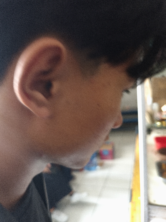A close-up, profile image depicts the right side of an individual's head, reportedly in the city of Muka, Indonesia. The subject, appearing male and of East Asian or Southeast Asian descent, has short dark hair and medium brown skin. The right ear is prominent, and a partial view of the right cheek and eye is visible as the individual gazes towards the right edge of the frame. A dark-colored garment is visible at the bottom left. The background is heavily blurred, revealing a vertical light-colored frame or post on the far right. Beyond this, indistinct colorful shapes (including red, blue, and pink) and a light-colored floor suggest an indoor setting, possibly a retail or commercial space. The image is somewhat grainy with a shallow depth of field.