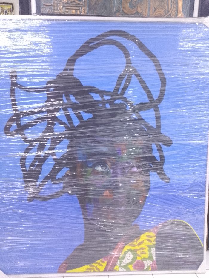 The image displays a large, vertically oriented portrait painting, encased in clear plastic wrap, situated indoors in Ikate, Nigeria