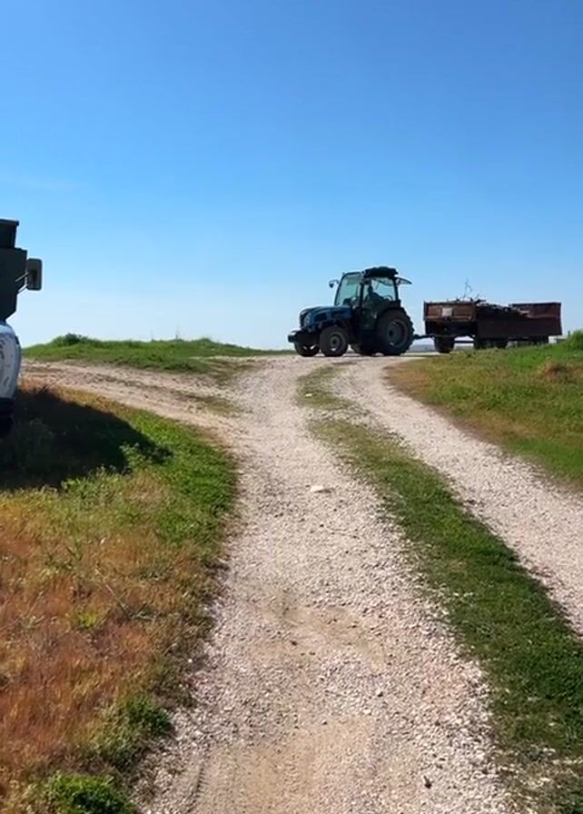 rural scene with a gravel road that splits into two paths. On the right path, a blue tractor pulls a trailer loaded with debris or scrap. The tractor and trailer are moving away from the camera, disappearing over a slight rise in the landscape. To the left of the road split, part of another piece of farm machinery is visible. The sky is clear and blue, and the roadside is covered with green grass and some patches of dry vegetation. The overall scene suggests an agricultural or rural setting.