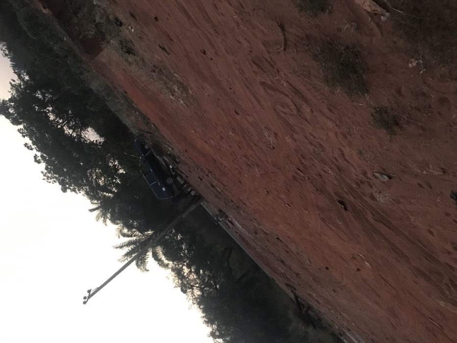 A dirt path stretches diagonally across the scene. To the left of the path is a line of trees, with a blue car visible among the trees. A tall utility pole extends from near the trees toward the sky. The dirt path has visible tracks. The sky is overcast. The overall tone is slightly muted.