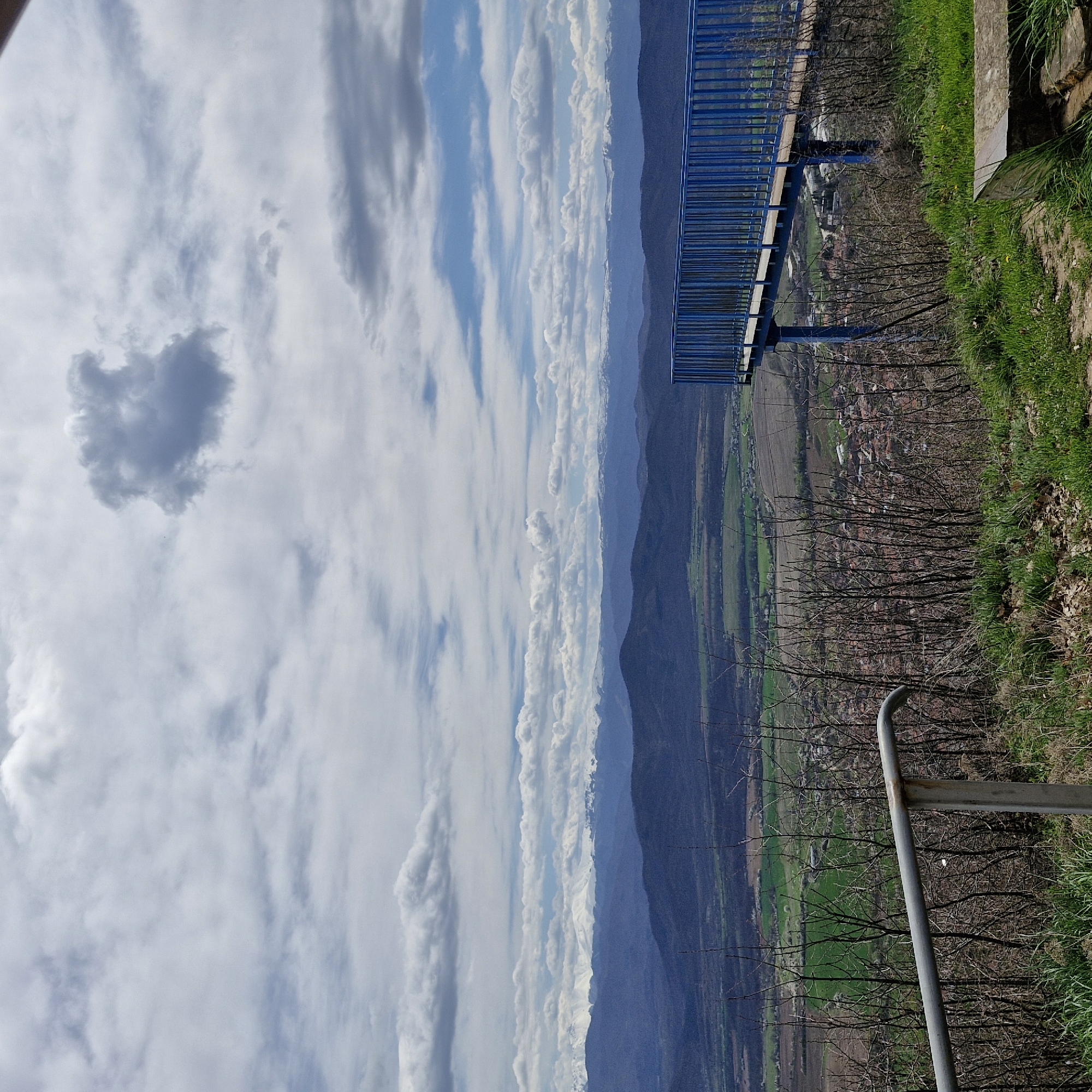 The scene is a landscape view from a high vantage point in Vrabevo, Bulgaria. In the foreground is a metal railing, and adjacent to it, greenery and vegetation indicating a hillside or elevated area. A blue metal fence is also visible further up. The middle ground features a valley with fields, sparse trees, and buildings suggesting a rural setting. In the background, there are mountains. The sky is dominated by numerous clouds.
