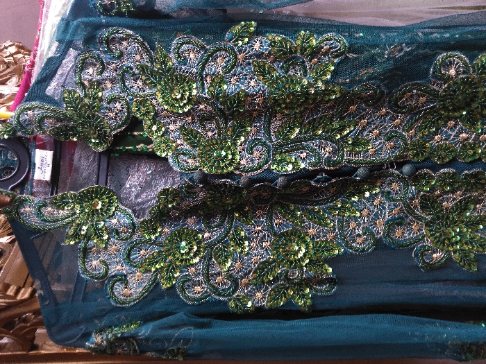 The image displays a dark teal, long-sleeved garment, appearing to be a tunic or jacket, made of a sheer or semi-sheer fabric. It is presented hanging on a black plastic clothes hanger. The garment features extensive and intricate embellishments, primarily consisting of gold and dark green embroidery forming ornate floral and curvilinear patterns across the front panel, the standing collar, and extending onto the sleeves. Numerous small, circular green sequins and beads are integrated into the embroidery, particularly within the floral elements, providing a shimmering effect. A vertical line of approximately five dark, fabric-covered buttons secures the garment's front opening. A white product tag, marked "Ample" and "M" (likely indicating size medium), is visible at the interior neckline, suspended from the hanger. The background is blurred, showing a reflective, golden-toned ornate object in the upper left quadrant and indistinct light-colored fabric or material on the right side of the frame. No individuals, actions, or interactions are visible. The visual information within the image is insufficient to determine its specific location in Maturin, Venezuela, or any other geographical point.
