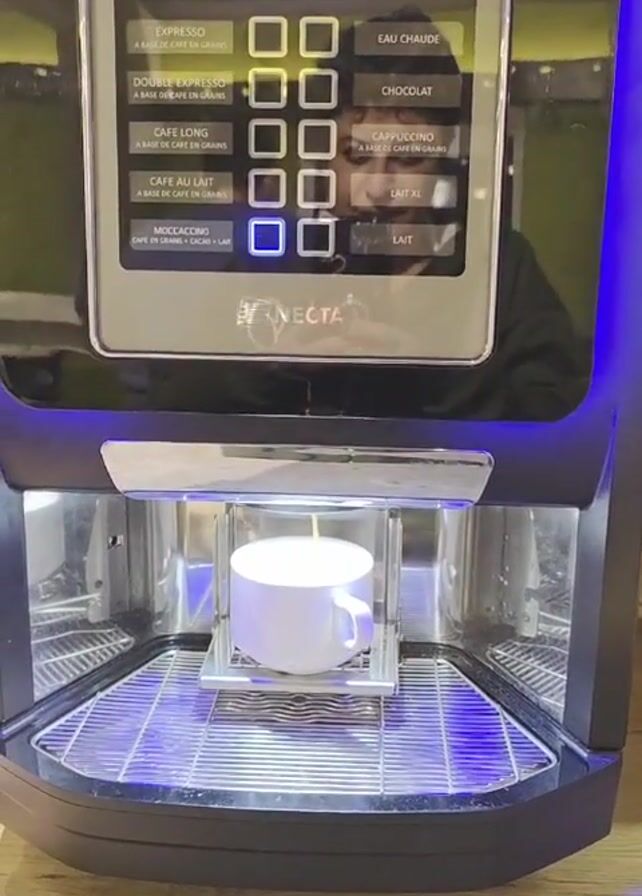 Necta coffee machine dispensing a mocaccino into a white ceramic mug. The machine is black with blue lights illuminating the dispensing area. The control panel shows various coffee options in French. The background reflection suggests someone is operating the machine. The mug is placed on a metal grate within the machine. The surrounding counter is wooden.