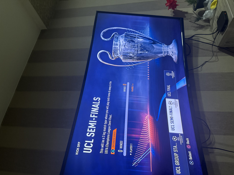 The image presents an indoor scene in Tbilisi, Georgia, centered on a large black flat-screen TCL television. The television is displaying the menu screen for a video game, specifically the "UCL SEMI-FINALS" stage of a UEFA Champions League simulation, indicating a "2 leg match type." The screen shows "0 WIN(S)" for both Player 1 and Player 2 and prominently features a detailed graphic of the UEFA Champions League trophy on its right side. Below the trophy, a navigation bar with "UCL GROUP STA...", "UCL SEMI-FINALS", and "UCL FINAL" is visible, with "UCL SEMI-FINALS" highlighted. The wall behind the TV is covered in wallpaper featuring alternating vertical stripes of light and dark gray. Below the television, a light-colored wooden cabinet or stand is visible, upon which a black electronic device with a small red indicator light rests, accompanied by several black cables connected to the TV. To the right on the cabinet, a small potted plant with green leaves and a red artificial flower are present, alongside a partially visible yellow plastic object. No people are visible in the scene.