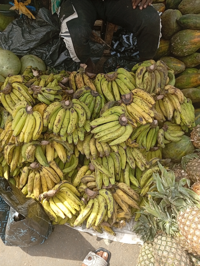 An outdoor market stall in Sabon Gari East, Nigeria, displays a large quantity of produce