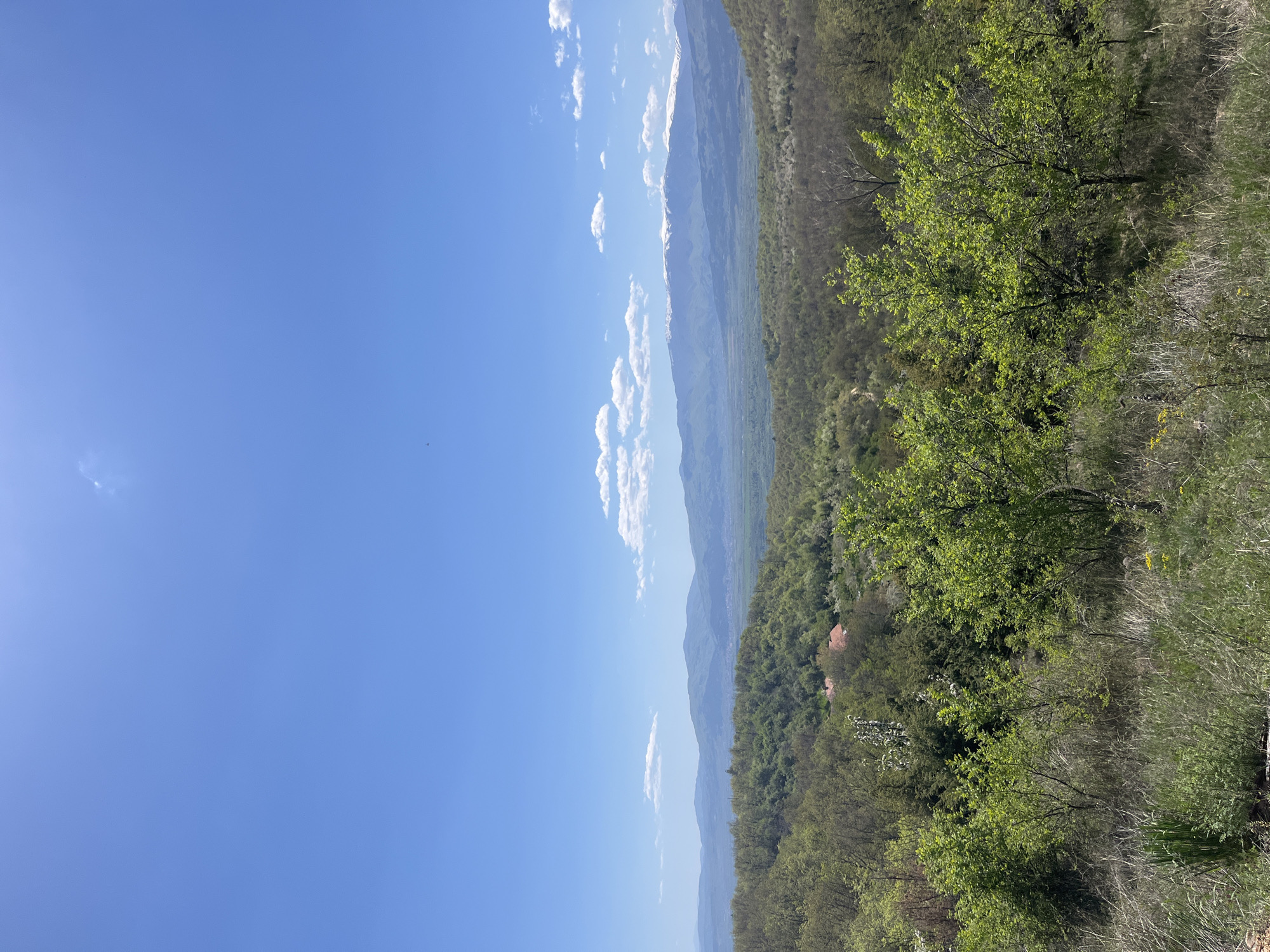 landscape in Razhdavitsa, Bulgaria. A clear blue sky with scattered white clouds takes up a significant portion of the frame. Below the sky is a view of rolling hills and mountains, some with snow-capped peaks in the distance. The foreground is dominated by green trees and vegetation, suggesting a mountainous or forested area. There are areas of dense forest. The overall scene suggests a rural or natural setting.