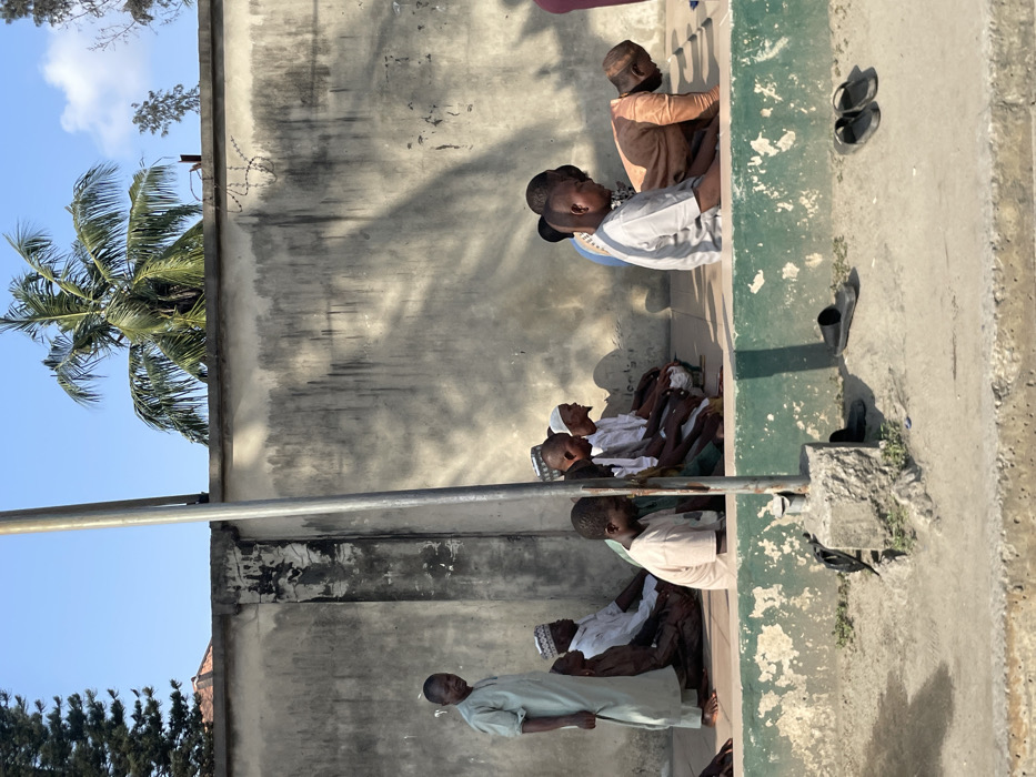 The image depicts an outdoor scene in Badore, Nigeria, under a clear blue sky. A group of approximately eight adult males are engaged in prayer, positioned on a raised, tiled platform in front of a weathered concrete wall. In the background, a tall, stained concrete wall with dark vertical streaks extends across the frame. Barbed wire is visible along the top edge of the wall to the right. Above the wall, a tall palm tree with lush green fronds is prominent on the right, and a coniferous tree is partially visible on the far left. In the midground, a metallic pole, likely a lamppost or signpost support, stands vertically, rooted in a concrete base on the lower ground level. This pole is situated in front of the praying individuals. The ground level below the platform is concrete, with some sparse green vegetation near the pole's base. Three pairs of dark-colored slippers or sandals are placed on this lower ground. The individuals on the platform are all male. One man on the far left stands barefoot, wearing a long, light-colored robe and facing towards the left foreground. The other men are either seated on their knees, most facing towards the right side of the frame, or in a state of prostration. Their attire includes various traditional garments and head coverings (kufis). One man on the right side of the group is prostrating with his face to the ground, wearing an orange/light brown garment. The scene is illuminated by strong sunlight, casting visible shadows.