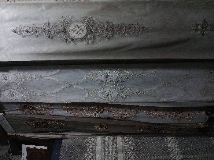This image depicts an interior scene within a textile or curtain establishment in Jaramana, Syria. The primary subjects are multiple vertically hanging fabric panels, displayed to showcase their intricate designs. No individuals are present. From right to left, the visible panels include: 1. A light grey opaque fabric featuring a prominent, vertically oriented embroidered design in a darker grey-brown hue. This design comprises a central oval motif with floral elements, surrounded by elaborate scrollwork. 2. A lighter grey, semi-sheer fabric exhibiting repeating patterns of embroidered medallions and draped, chain-like motifs in a silver tone. 3. A darker grey-brown opaque fabric adorned with dense, gold-colored baroque-style embroidery. 4. A partially visible light grey mesh or lace-patterned fabric with white geometric and floral designs. In the upper left corner, a small, framed object, possibly another fabric sample or decorative item, is visible hanging against a darker surface. The overall lighting is moderate, accentuating the textures and detailed embellishments of the displayed textiles.
