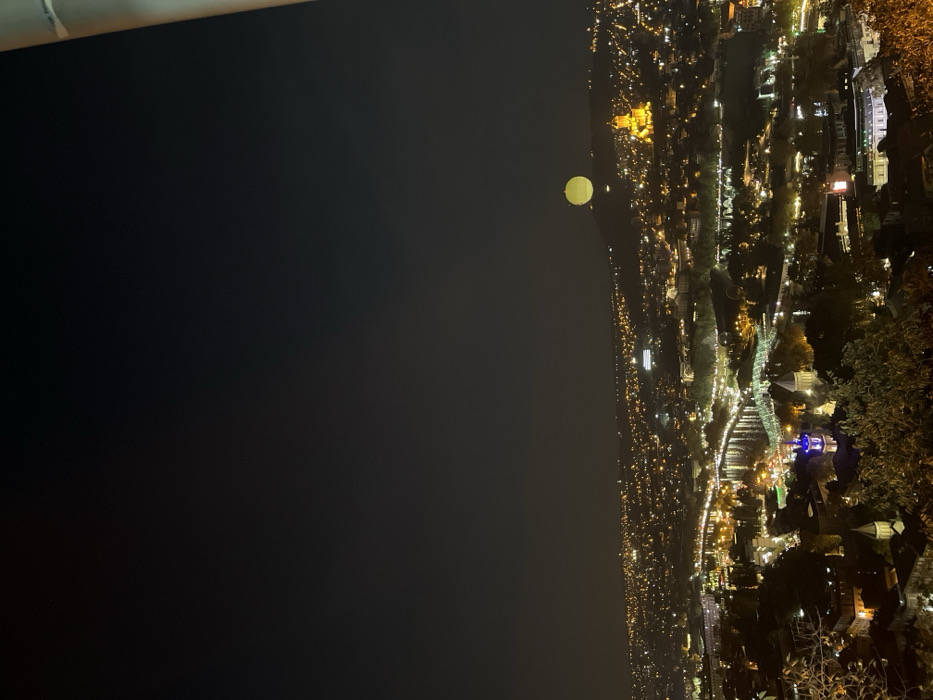 This image captures a panoramic nighttime view of Tbilisi, Georgia, observed from an elevated position, likely from Narikala Fortress or a similar high vantage point in the Old Town area. The scene depicts a sprawling cityscape illuminated by numerous artificial lights under a dark sky. A large, prominent, bright yellow full moon is visible in the upper right quadrant, appearing low above a distant, dark hill. The Mtkvari River flows through the center of the city, reflecting the vibrant lights from structures along its banks. The distinctive, modern arched pedestrian Bridge of Peace, illuminated with green and white lights, spans the river in the mid-ground. To the right, the Holy Trinity Cathedral of Tbilisi (Sameba Cathedral) stands prominently on a hill, brightly illuminated with golden light, making its distinctive domes and architecture clearly visible. Various other buildings and streets are visible across the urban expanse, marked by clusters of orange and white lights extending into the hazy distance. Hills surround the city, with some exhibiting scattered lights from development while others remain dark silhouettes against the night sky. In the immediate foreground, dark, indistinct foliage is visible on the lower left. A light-colored, vertical structural element, possibly a column or railing, partially frames the scene on the far right edge. No individuals or specific actions are discernible within the frame.