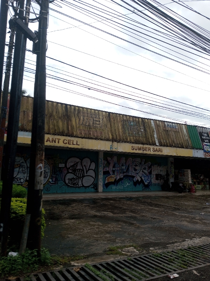The scene depicts a street view of a commercial building in the city of Kamji Na-Yekha, Bhutan. Overhead, numerous black electrical or communication wires span across a light grey, overcast sky. Two dark, weathered utility poles stand in the left foreground. The commercial building features a faded yellow-gold corrugated metal upper facade, showing signs of wear and dark staining. Below this, a horizontal band of lighter yellow-beige spans the building. Two central storefronts are closed and covered extensively with multi-colored graffiti, including a white and black cartoonish design, stylized lettering such as "DEBAT," "SLEP," "YAMOR," and "AMASKLY." Above these graffiti-covered sections, partial signs read "ANT CELL" and "SUMBER SARI" in dark lettering. To the right, an adjacent storefront appears open, displaying stacked white sacks and a red object; a black scooter or motorcycle is parked in front. Text on this section of the facade includes "TOKO KARTIK & BARU" and "TYBO." The foreground features dark, wet-looking asphalt or concrete pavement, with a dark metal drainage grate running along the bottom edge. Green foliage and weeds grow near the utility poles and the pavement's edge on the left. No individuals are visible.