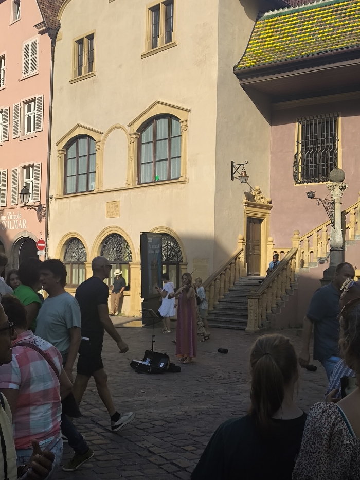 The image depicts a daytime scene within the Place de l'Ancienne Douane in Colmar, France. The foreground features a crowd of individuals, many partially obscured or in profile, moving across a cobblestone square. In the middle ground, a female musician in a long pink dress plays a violin. Directly in front of her on the ground is an open black violin case, alongside a microphone stand and a black speaker. To her left, a young boy stands, and a woman in a white dress is visible. The background is defined by three distinct historical buildings. To the far left, a multi-story pink building with multiple windows and white shutters is partially visible, with a sign reading "MAISON VINICOLE COLMAR" on its lower level. Adjacent to this, a prominent cream-colored building features a series of arched windows at ground level, and two large arched windows on the first floor with ornate stone surrounds, above which a recessed panel is present. Further above are two smaller rectangular windows. An inscription is visible on the façade above the ground-level arches. To the right, part of the Koïfhus (Ancienne Douane) is visible, characterized by its reddish-pink façade and a distinctive roof composed of green and yellow tiles. A grand exterior stone staircase with a balustrade ascends from the square towards a wooden entrance door. An individual is seated on the lower steps of this staircase. Another individual wearing a white hat is partially visible within a ground-level doorway of the cream building. Sunlight illuminates the scene, casting shadows on the cobblestones.