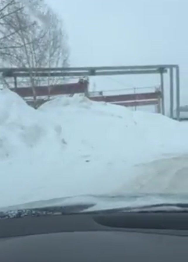The view from inside a car driving on a snow-covered road. The road is lined with large piles of snow, and bare trees are visible in the background. In the distance, metal structures and pipes can be seen. The sky is overcast, and the windshield has some water spots.