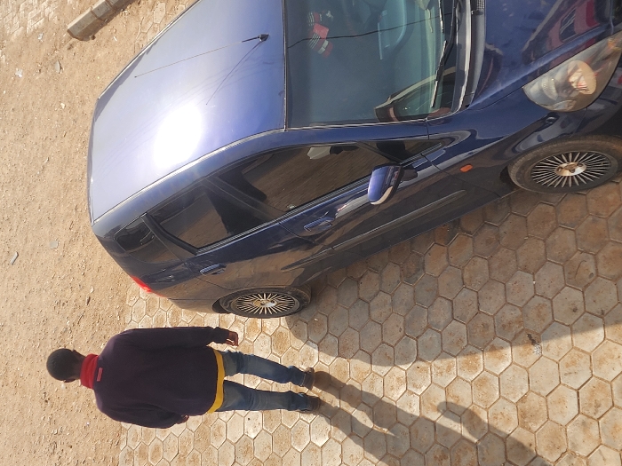This image, captured from an elevated perspective in Jos, Nigeria, depicts an outdoor scene under bright sunlight. A dark blue compact hatchback vehicle, possibly a Hyundai i10, is parked on a surface composed of light brown hexagonal interlocking pavers. The car features multi-spoke silver alloy wheels, a driver's side mirror matching the body color, and a rear roof antenna; its top surfaces exhibit strong solar reflections. To the left of the vehicle, a male subject is observed from behind, walking towards the upper left. He is dressed in a dark blue long-sleeved shirt with a red collar, a yellow layer visible beneath, blue jeans, and light brown footwear. A prominent shadow from the individual extends diagonally across the paved ground. Beyond the paved area, the terrain is unpaved and consists of dry, light brown soil. A fragment of a light-colored pole or column is visible on the upper right edge of the paved surface.