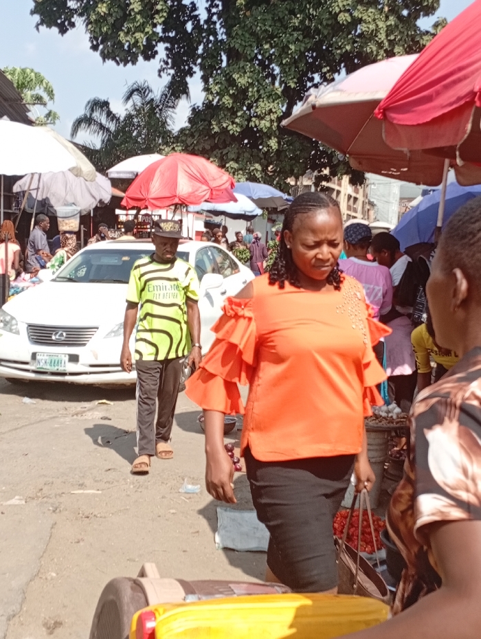 A woman in an orange top and black skirt walks through a busy outdoor market. She carries a bag of red produce. A man in a green and black striped shirt walks in the background beside a white car. Umbrellas shade vendors and shoppers. People mill around stalls with merchandise visible. The scene suggests a vibrant, crowded marketplace.