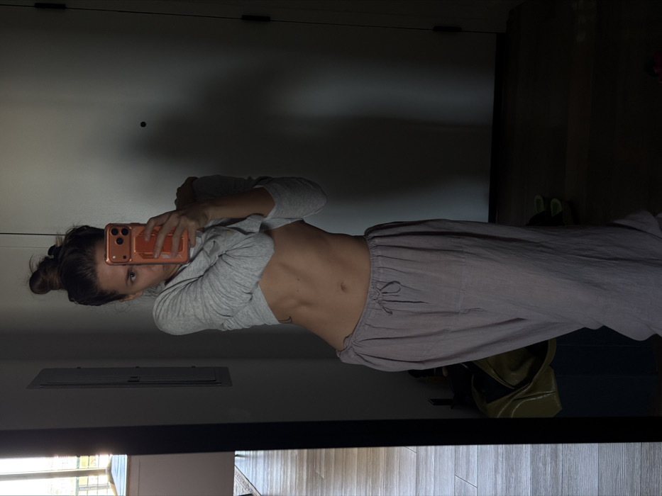 A woman poses for a mirror selfie, holding her phone up. She wears a light gray cropped long sleeve shirt and light purple drawstring pants. Her midriff is exposed, revealing defined abdominal muscles. She has her hair up in a bun. The background shows a white wall with a door and a glimpse of a window at the bottom. The floor is a light wood. There is a green object visible in the bottom right.