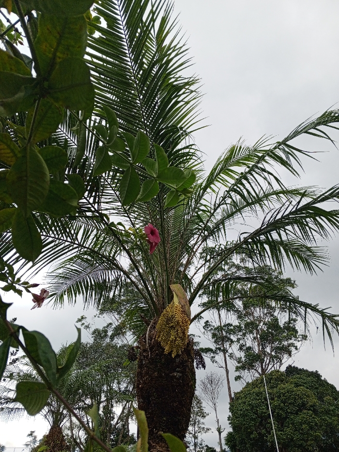 The scene, located in Ciherang, Indonesia, presents a low-angle view of a palm tree under an overcast, light grey sky. The central palm features a dark, textured trunk supporting numerous green, pinnate fronds radiating upwards and outwards. A prominent yellow-tan inflorescence or fruit cluster is visible emerging from the crown of the trunk, beneath the fronds. A single magenta-pink flower is observed among the fronds on the left side of the palm, with a second, partially obscured flower of similar color present in the lower-left foreground. Blurred green foliage from an unseen plant occupies the immediate foreground. The background reveals a dense arrangement of various other trees, exhibiting diverse canopy shapes and heights. No people or animals are visible.