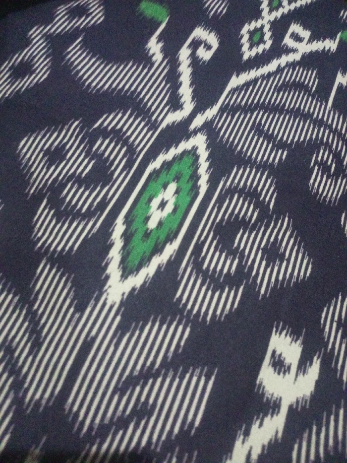 The image presents a close-up, angled view of a textile fabric exhibiting a patterned design. The fabric features a dark blue background. Overlaid on this are intricate motifs in white and green. The white patterns are composed of numerous short, parallel, diagonal lines that form various shapes, including curvilinear elements and more angular, jagged designs. A prominent feature is an elongated, vertically oriented, somewhat diamond-shaped motif with pointed ends, which is filled with a medium green color and contains a central white cross-like pattern. The edges of the patterns exhibit a slight blurring, consistent with a resist-dyeing technique such as ikat. No individuals, actions, or wider environmental context are visible within the frame. The image does not contain any visual information to determine a specific location within the city of Zee Pin Kone, Myanmar.