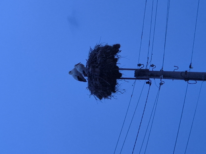 The scene is located in Mechkarevo, Bulgaria. Two white storks are situated within a large, dark nest constructed from branches and nesting materials. The nest rests directly atop a gray utility pole. Multiple dark electrical wires extend horizontally from the pole, secured by various ceramic or glass insulators. The environment is illuminated by low light, casting a uniform deep blue across the sky, consistent with dusk or nighttime conditions. No human subjects are visible.