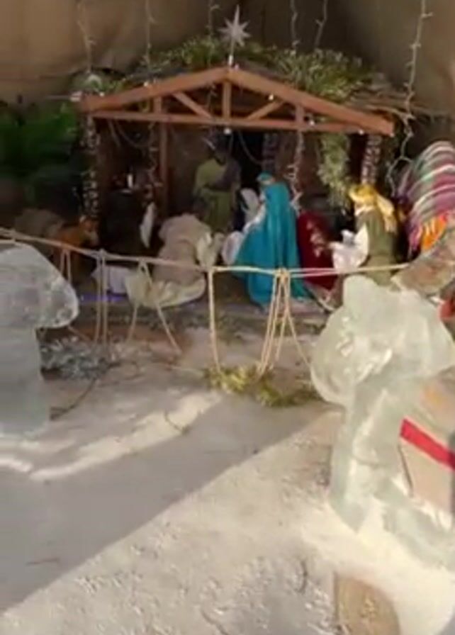 detailed Christmas nativity scene. The scene includes figurines representing Mary, Joseph, baby Jesus, the three wise men, and several animals, including camels and a donkey. The figures are arranged inside a wooden stable decorated with a star, lights, and tinsel. The ground is covered in white material resembling snow, with additional decorative elements like small fences and ice-like sculptures of animals placed in front of the stable. The backdrop is a simple wall, possibly designed to resemble the desert landscape where the biblical event took place.