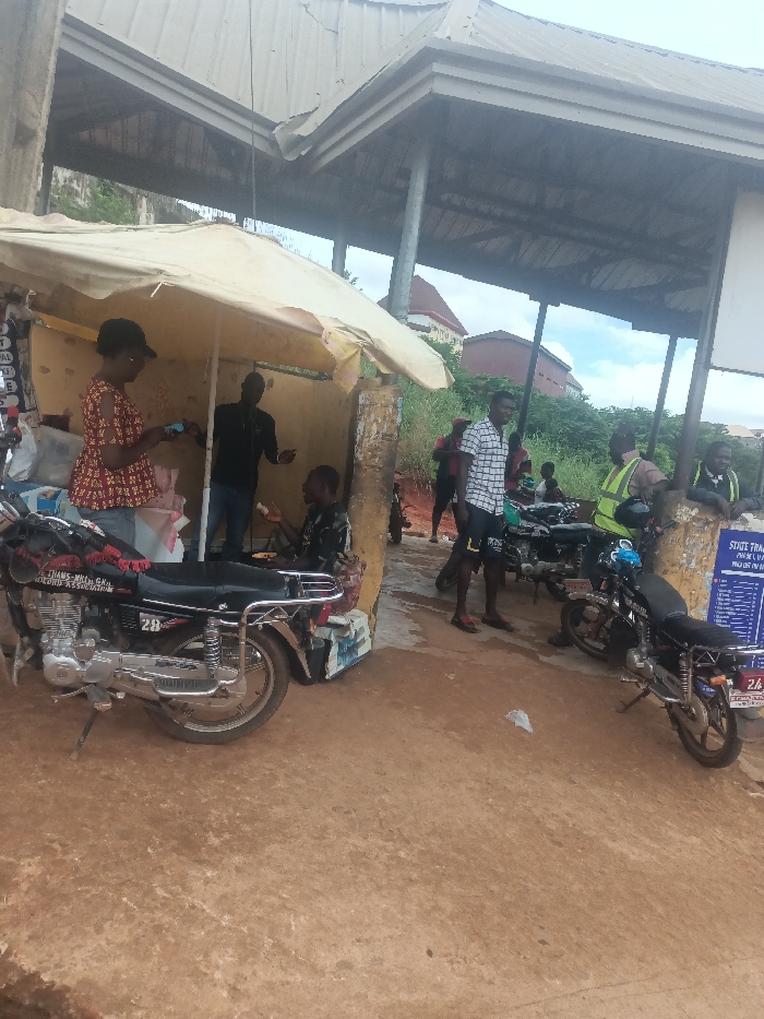 This image captures an active outdoor commercial area in Unguwar Kaya, Nigeria, under an overcast sky. In the foreground, the ground is composed of reddish-brown dirt. A large, light-colored metal roof structure with visible support pillars spans the middle-ground, providing shelter. To the left, a smaller, makeshift stall with a light-colored tarp roof and rough-hewn supports houses three individuals. A woman wearing a patterned top and dark cap stands, holding a blue object. A man in a dark shirt stands behind a counter, gesturing towards another man seated in a patterned shirt, who holds a light-colored object. Adjacent to the stall on the left, a black motorcycle with chrome accents is parked on a kickstand; text on its side reads "TRANS-NNT. GHA HOLDING ASSOCIATION" and "28" is visible on the rear fender. To the right, under the main roof structure, multiple individuals are present, including a man in a white and black plaid shirt standing centrally, and another man in a bright yellow-green reflective vest standing near a pillar with a blue informational sign. A second black motorcycle with a red seat and license plate "24" is parked to the right. Additional motorcycles are partially visible further back. In the background, beyond green foliage, several buildings with reddish roofs are discernable.