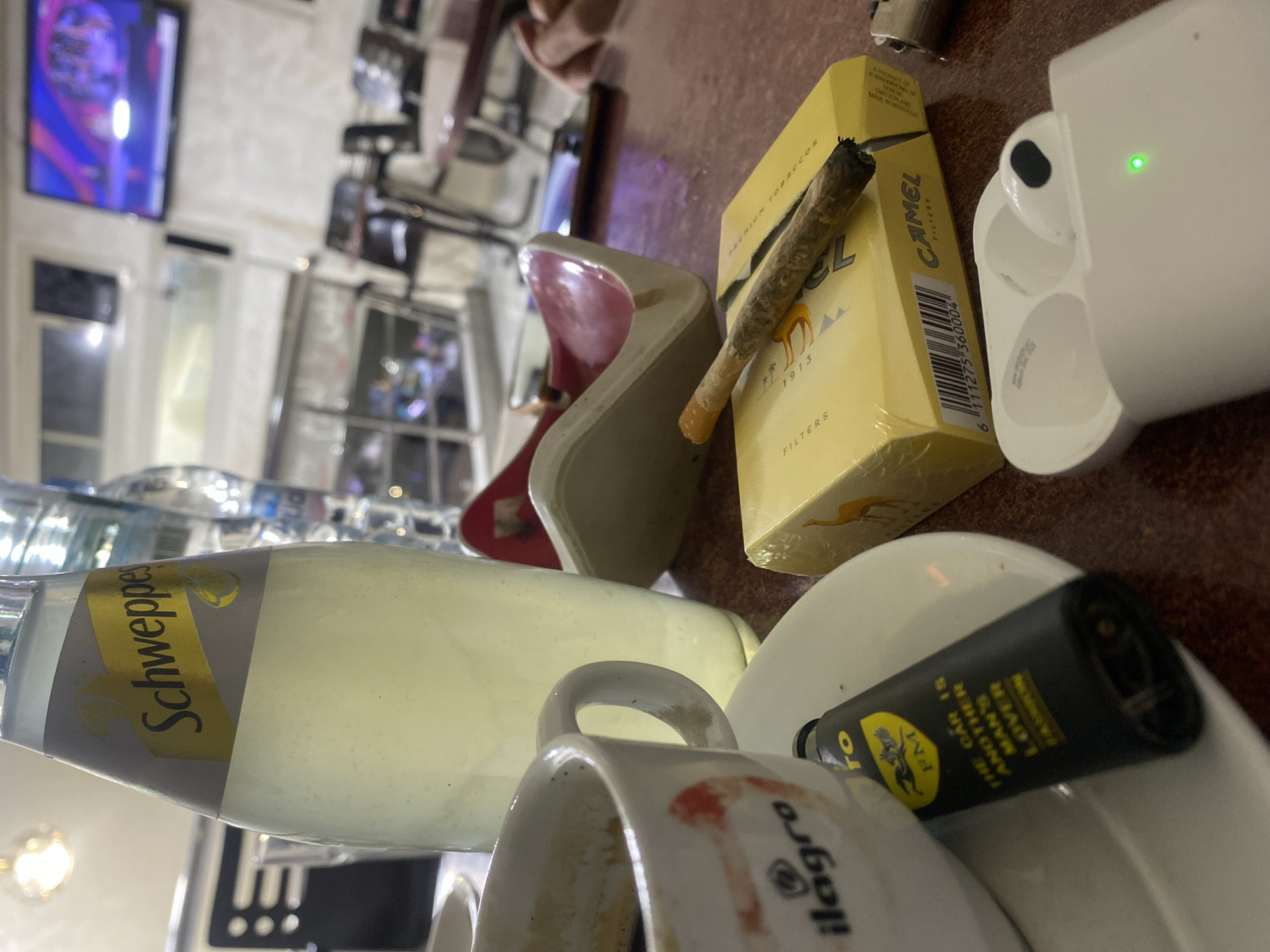 The image depicts a table in a cafe or lounge in Meknes, Morocco. In the foreground, a white ceramic mug with "ilagro" branding on a white saucer contains dark liquid residue. A black lighter with yellow text, including "PM" and "THE CAR IS ANOTHER MAN'S LOVER," rests on the saucer. To the right, a clear glass bottle of Schweppes lemon-flavored soda, partially full, stands upright next to a clear plastic water bottle. On the reddish-brown tabletop, a yellow, plastic-wrapped pack of Camel Filters cigarettes (barcode 6111275360004) serves as a rest for a partially smoked, hand-rolled cigarette. Behind these items, a two-toned ashtray (beige exterior, red interior) is visible. A white, open Apple AirPods case with an illuminated green indicator light is in the bottom right, next to a silver-colored lighter. A dark-colored smartphone is partially visible near the ashtray. The blurred background shows the interior of a commercial space with dark tables and chairs, a lit display case on the left, and a wall-mounted television displaying colorful graphics on the right. No individuals are clearly identifiable.