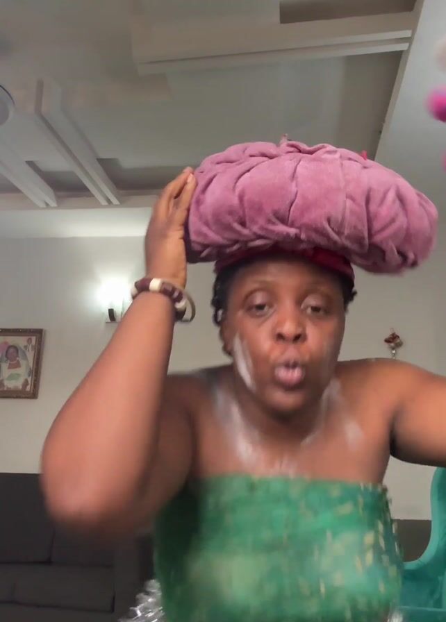 A person is dancing in a room, wearing a green wrap around their torso and a silver garland around their hips. They also have white powder on their chest and a pink, pillow-like object balanced on their head. In the first shot, a pink stuffed elephant with purple hair sits atop the pillow. The person is moving their arms rhythmically as they dance. The room appears to be a living room, with a gray sofa visible in the background, as well as a framed picture on the wall. The ceiling has a modern design with built-in lights.