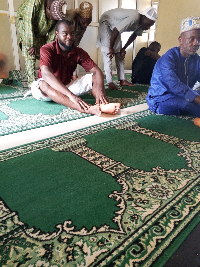 The image portrays an indoor scene within a prayer hall, likely a mosque, located in Lokoja, Nigeria