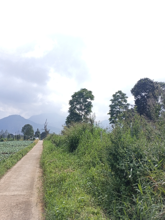 This image depicts an rural landscape in Na Sangkham, Laos, under an overcast sky. A narrow, light-colored concrete or dirt path extends from the foreground into the mid-ground, slightly curving to the left. To the left of the path, a wide cultivated field, appearing to contain a crop such as cabbage or lettuce, stretches into the distance. A white vehicle, possibly an SUV or pickup truck, is partially visible on the left side of the path in the mid-ground, positioned behind the cultivated field. To the right of the path, dense green vegetation consisting of various grasses, shrubs, and small trees forms an overgrown embankment. Several taller trees with full green canopies rise above this vegetation on the right side of the path, alongside a bare-trunked tree in the mid-ground. In the background, multiple layers of hazy blue-green mountains extend across the horizon, partially obscured by the cloudy sky. No individuals or animals are present. No explicit actions or interactions are depicted.