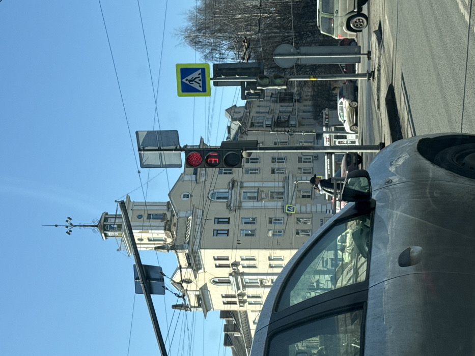 The image displays an urban street scene on a clear, sunny day, identified as located in the city of Rusanovo, Russia. In the immediate foreground, the dirty, silver-grey front-left quarter of a passenger vehicle is visible, including a portion of its windshield, side window, and driver's side mirror. In the midground, a traffic light displaying a red signal with a digital countdown of "31" is prominent. To its right, a blue square sign with a white pedestrian symbol indicates a crosswalk. Overhead, a network of black utility wires traverses the scene. A solitary individual, appearing male and wearing a dark cap and jacket, is observed walking on the street or sidewalk near the traffic light, moving right-to-left. Further down the street, a light-colored sedan or small SUV is stationary. To the far right, a dark-colored SUV is also visible on the road. The background is dominated by a multi-story, light-colored (beige/cream) building featuring intricate architectural details, including arched windows and decorative elements. A distinctive tower structure rises from the top of this building, culminating in a small, enclosed observation deck or balcony and a pointed finial equipped with what appear to be antennae or decorative metalwork. Additional, less distinct buildings line the street behind the main structure, and a cluster of bare trees is visible on the far right under a clear blue sky.