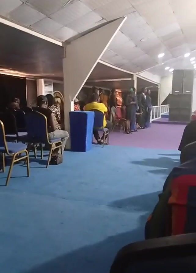 dimly lit indoor space, likely a church or a community hall. The foreground features empty blue chairs, with a few people seated. A man in a yellow shirt sits on one of the chairs. The floor is covered in a mix of blue and purple carpet tiles. In the background, a group of people stand near a low white railing, some dressed in dark clothing. A small picture or image appears on a stand against the wall behind them. The scene seems to capture a moment during an event, perhaps before or after a performance or service.