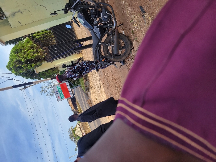 A rotated view shows a motorcycle parked next to a road. A person in camouflage and red beret stands near the bike. A man in a suit walks down the road, passing a sign with red and green. Wires run overhead against a blue sky. A portion of a purple garment with tan stripes dominates the foreground.